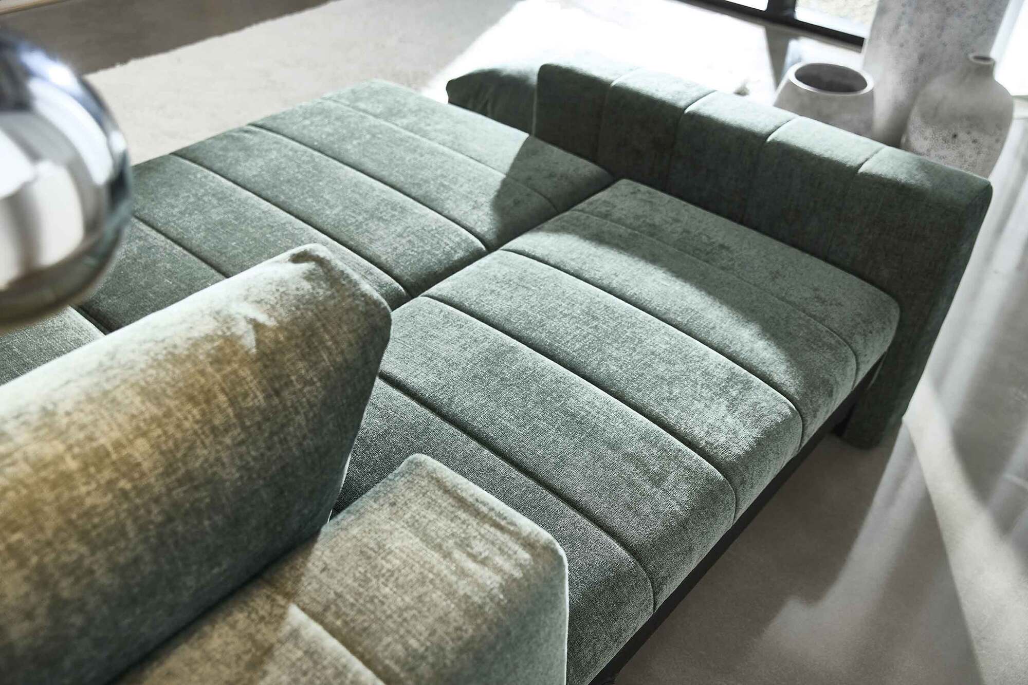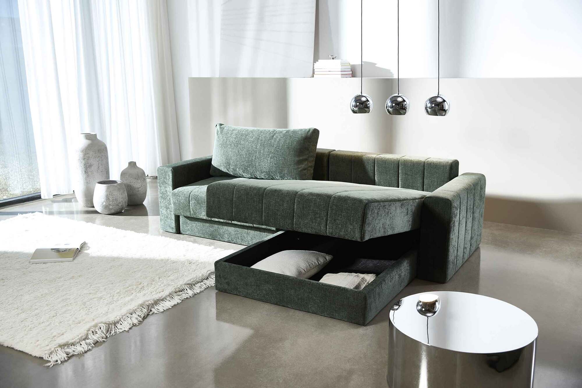 The modular chaise can be placed on either the left or right side, allowing you to adapt the sofa to your space. Hidden storage beneath the seat provides a practical solution for bedding, cushions, or other essentials, helping you keep your living area neat and stylish.
