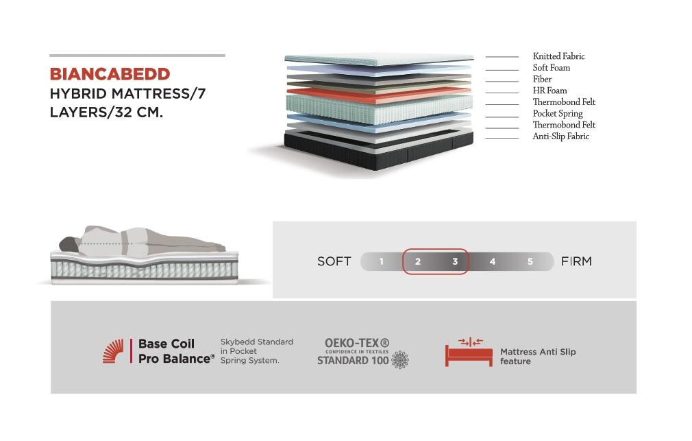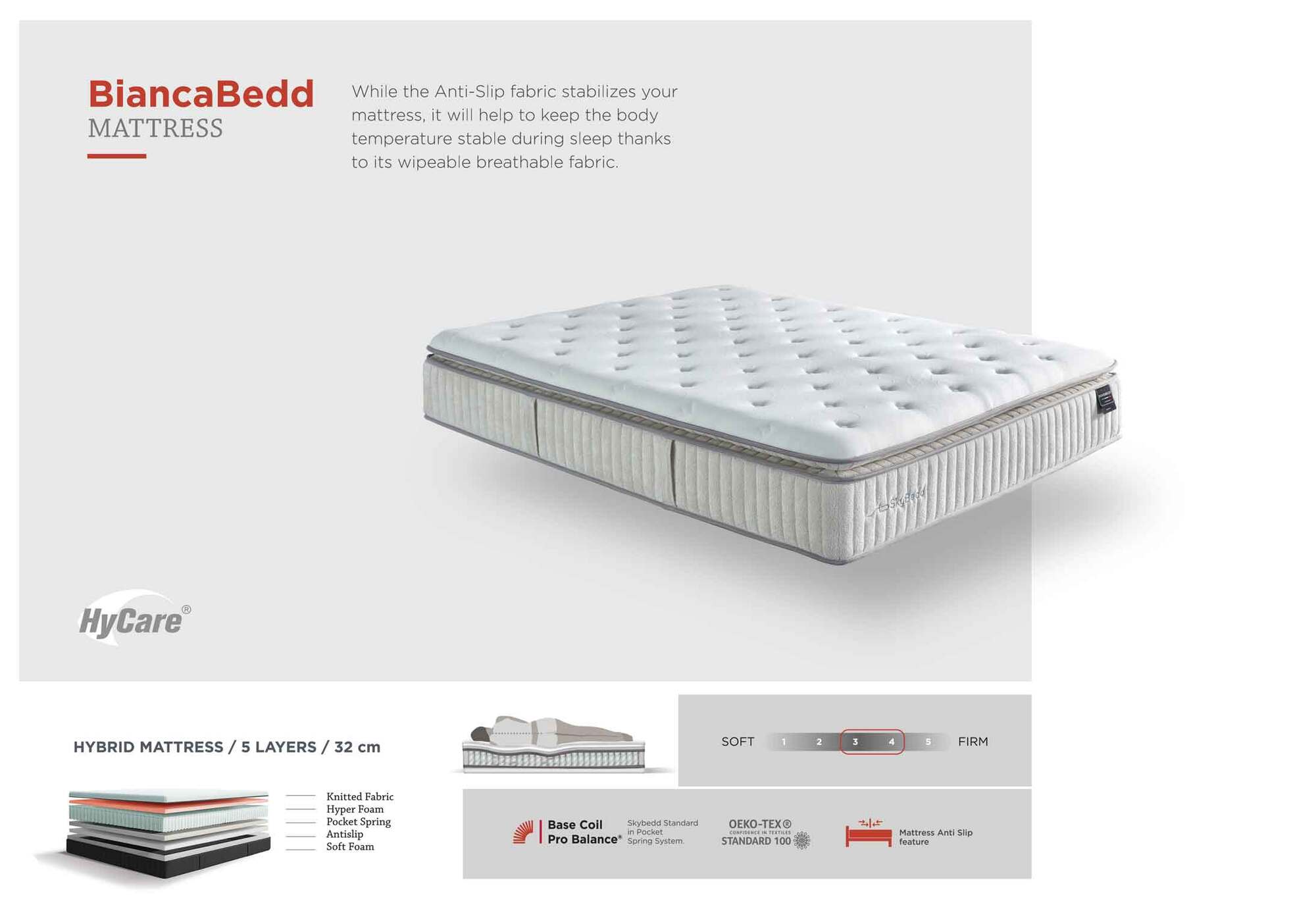 BiancaBedd- og Elasty-madrassen kombinerer luksuriøs blødhed med avanceret hybridteknologi, der støtter kroppen præcist dér, hvor du har brug for det. Resultatet? En roligere nat, en lettere morgen – og en komfort, du kan mærke med det samme.
