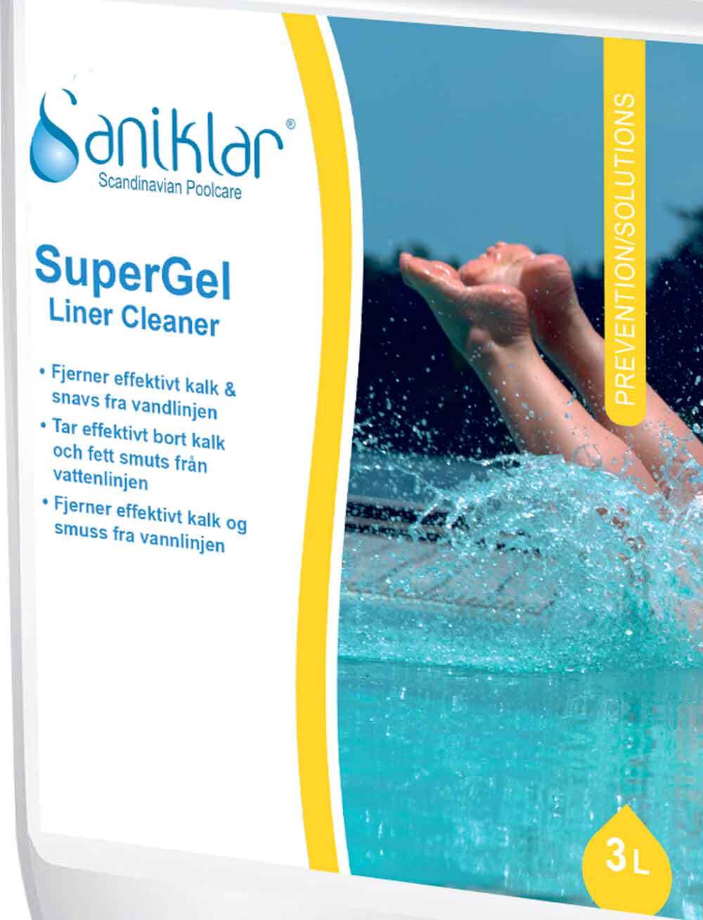 Saniklar SuperGel 3 liter er et effektivt middel til at fjerne genstridige belægninger og smudskanter omkring swimmingpoolens vandlinje. Flasken indeholder 1 liter, og gelkonsistensen gør produktet meget velegnet til rengøring af lodrette flader.